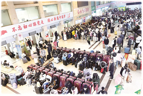 图为“双节”期间南阳站候车室旅客候乘情况